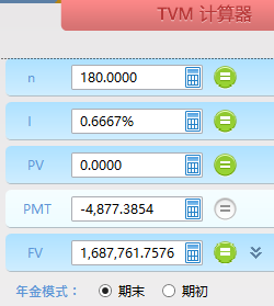第四步:求定投金额,期末普通年金,n=180,i=8%/12=0.6667%,FV=1,687,761.76元,计算出PMT=-4,877.39元,截图如下: