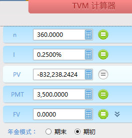 第二步:计算社保养老金在退休时点的供给,为期初普通年金现值,n=360,i=3%/12=0.25%,PMT=3,500,计算出PV=-832,238.24元,使用金拐棍软件,截图如下: