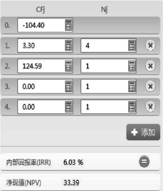 使用金融计算器操作步骤如下:第一步,计算各年现金流,购房时房价与税费共计108万元,并收取第1年房租3.6万元,则CF0=-104.4万元;第1~4年年末,收取租金并进行房屋的维护,则CF1=3.6-0.3=3.3万元,N1=4;第5年年末,进行最后一次维护并售房,缴纳相关税费,则CF2=100×(1+8%)^5×(1-15%)-0.3=124.59万元。第二步,将各年现金流代入金融计算器计算IRR,如下: