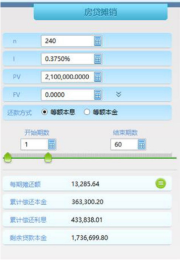 先通过房贷摊销计算器求出每月还贷金额13,285.64和卖房时剩余房贷:1,736,699.80,如下图所示: