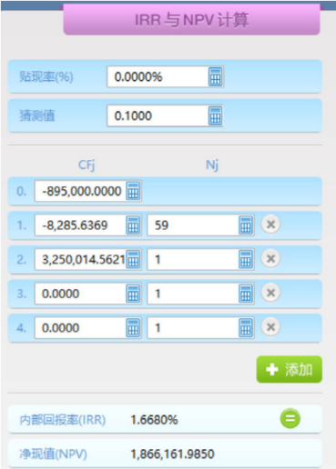 租金属于期初年金,还房贷是期末年金,各期现金流如下:0时点现金流=租金收入5,000-首付款900,000=-895,000;中间现金流=租金收入5,000-每期摊还额13,285.64=-8,285.64,N=59;最后一期现金流=卖价5,000,000-每期摊还额13,285.64-剩余本金1,736,699.78=3,250,014.56,N=1。计算出IRR=1.6680%,如下图所示: