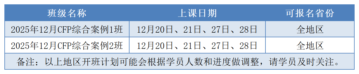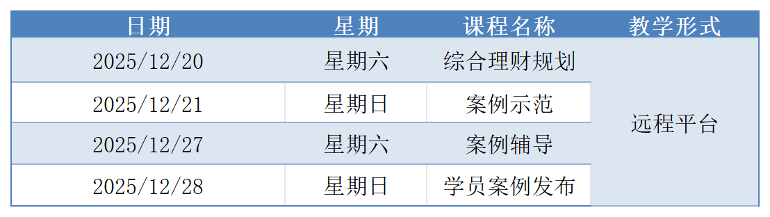 大家好!为了满足更多学员参加CFP综合案例培训的需求,理财教育网制定了2025年12月 “线上互动教学模式”开班计划。具体课程安排如下: