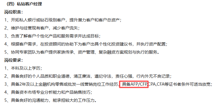 招商银行连续在多地、多岗位中明确“AFP/CFP持证人优先”,正是看中了AFP/CFP证书背后的专业素养与综合服务能力,反映出行业对高品质理财人才的需求。