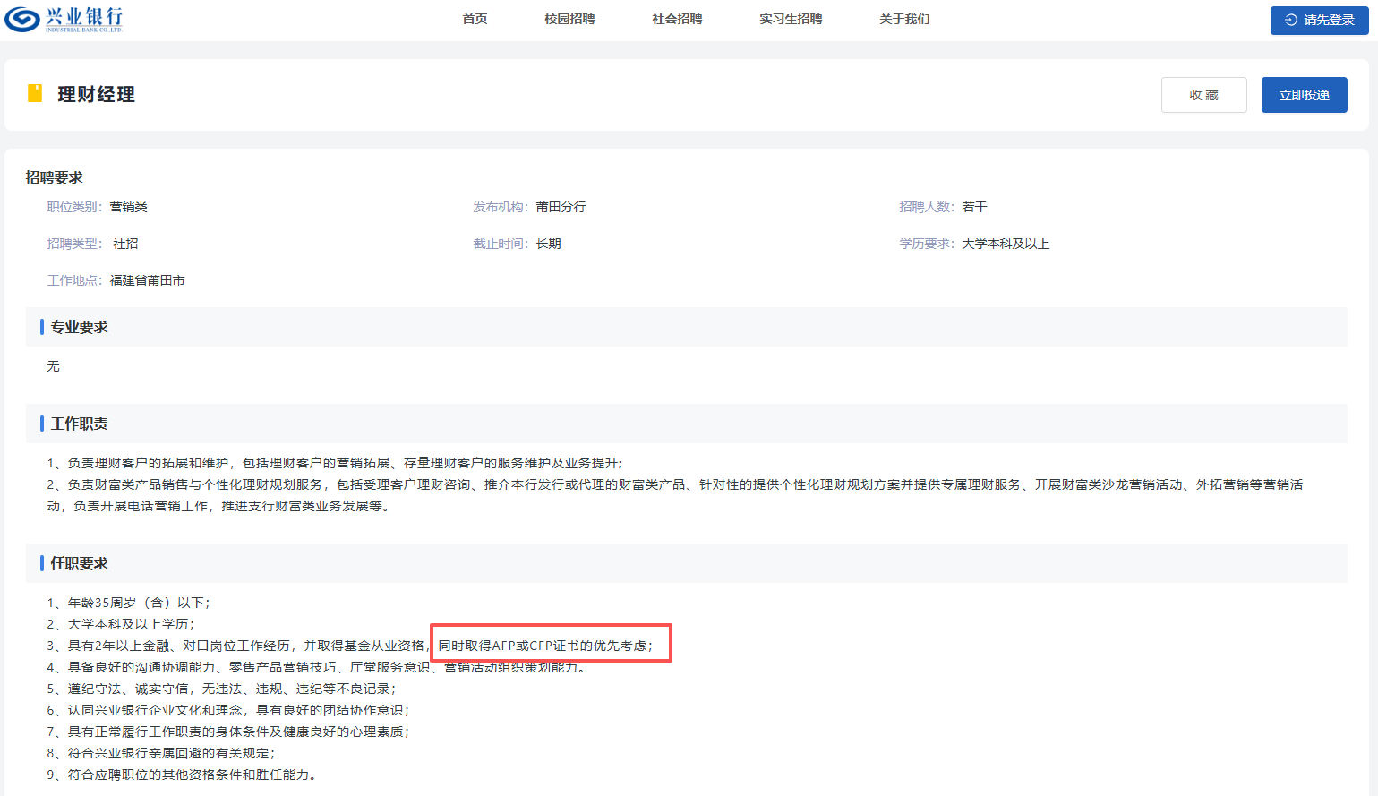 多家银行理财岗位招聘,AFP/CFP证书成加分项