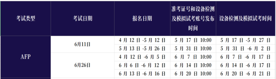 还有一点,学员要注意,就是AFP在线考试和线下考试的最大去区别是,学员要自己在家进行设备检测及模拟试考。不同时间段报名的考生,设备检测及模拟试考时间安排详见下表:
