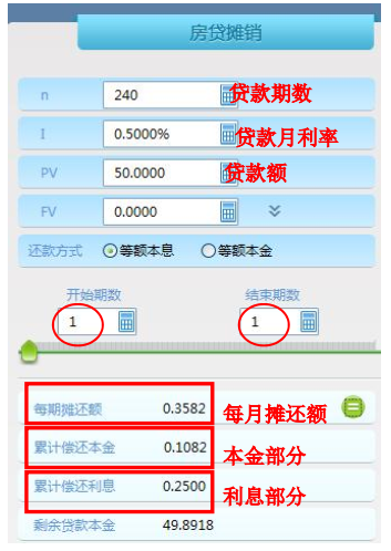 考虑抵利型房贷,计息贷款本金余额为40万元,第1个月还款利息为0.2万元,当月本金还0.1582万元;