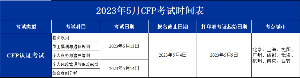 2023年5月份共有两场CFP考试,具体每场考试时间安排如下: